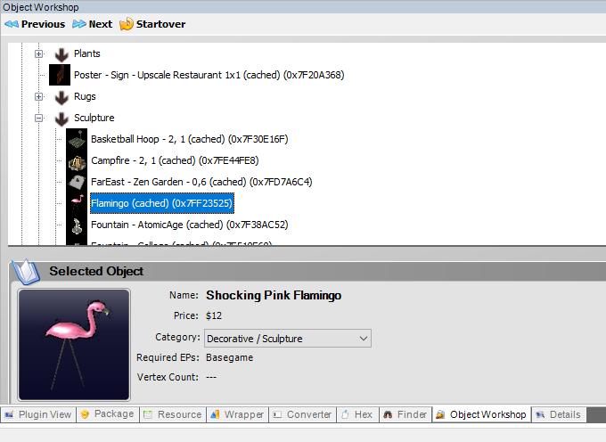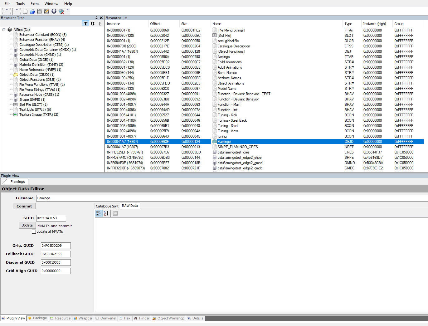 The astute will recall that that I previously mentioned changing the object’s GUID, group number, and resource names. Fortunately, we have aleady modified the resource names in Step 5. Additionally, if you’ve performed Step 4 as shown above, your group number should be 0xFFFFFFFF, which means the .package has already been made Private or self-contained. This means that all that is left is changing the GUID. Every OBJD file has its own GUID, and it is the OBJD that allows an object to appear as a Simantics object (in the catalogue or otherwise) in-game. Currently, our cloned .package is using the Flamingo’s GUID, which isn’t what we want.