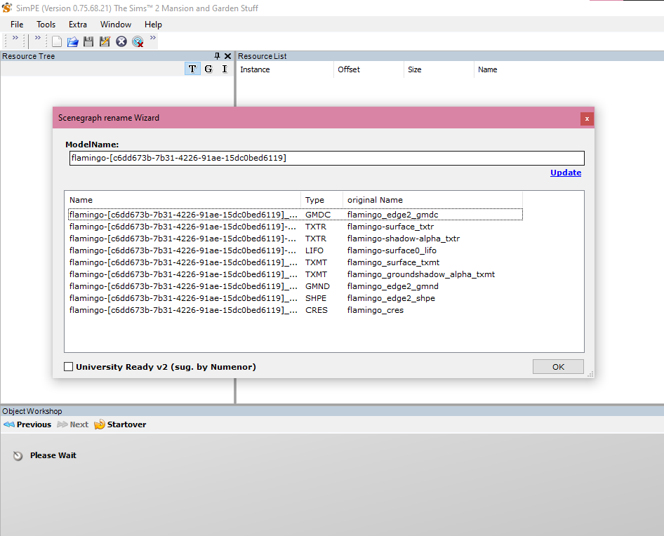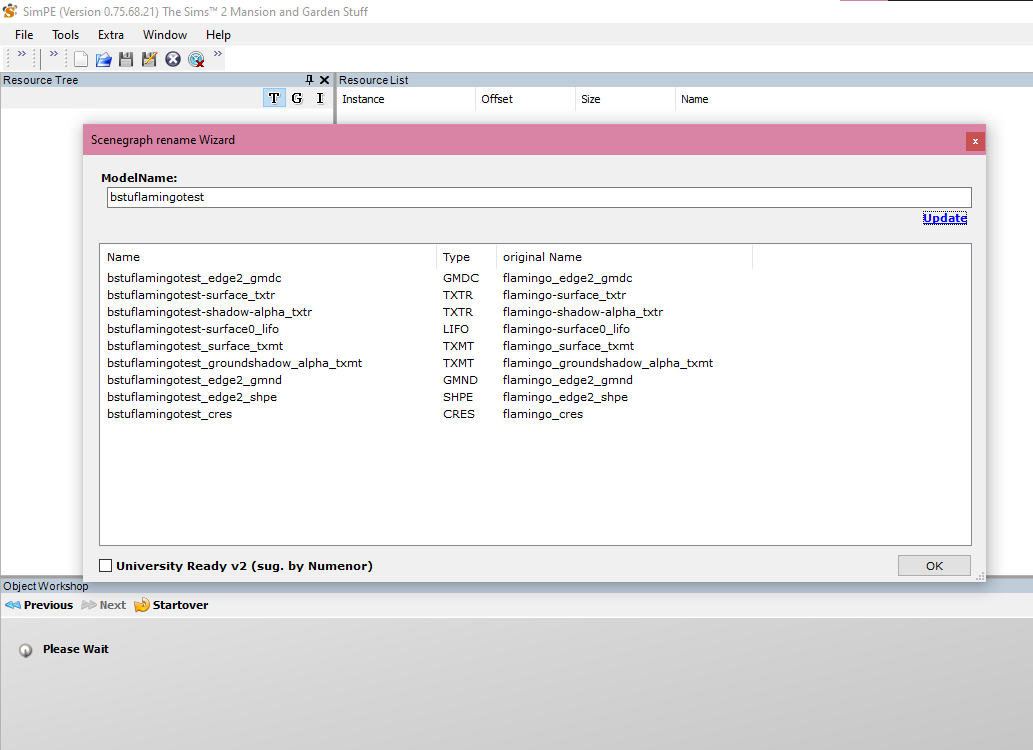 Step 5: If you’ve selected [ ] a pop-up will appear prompting you to rename the Scenegraph resources. This is necessary so that the 3D resources for the object (meshes textures, etc.) do not override game resources. Luckily, SimPE automatically appends a random hashed value to these resources, so all you need to do is hit ‘Update’ and then ‘OK’. Personally, I don’t use the generated prefix – I prefer legibility and have my own theory that longer resource names may hurt performance – you may choose to use your own prefix but ensure that it is something unique that is unlikely to clash with other CC. Using your creator name is a good bet.